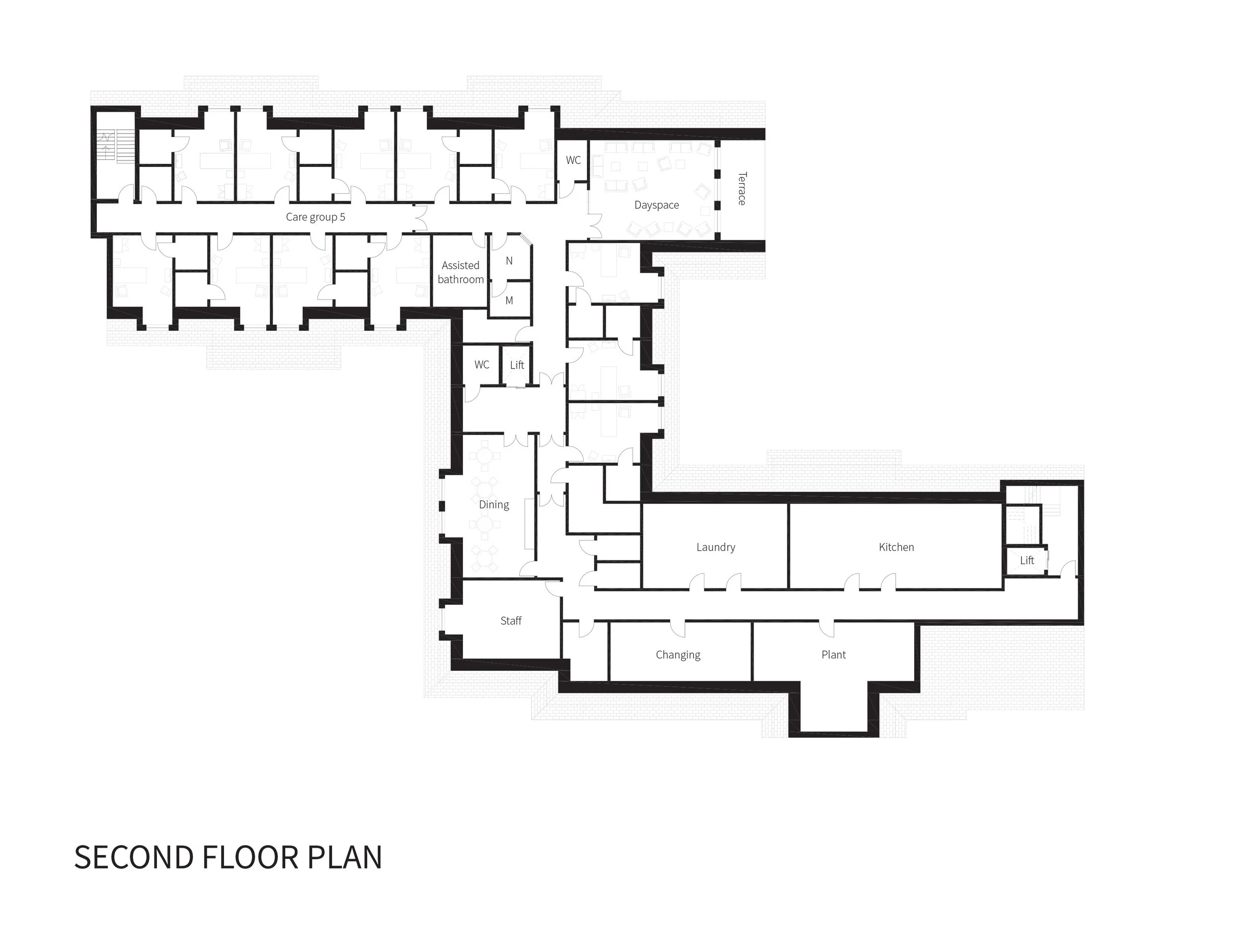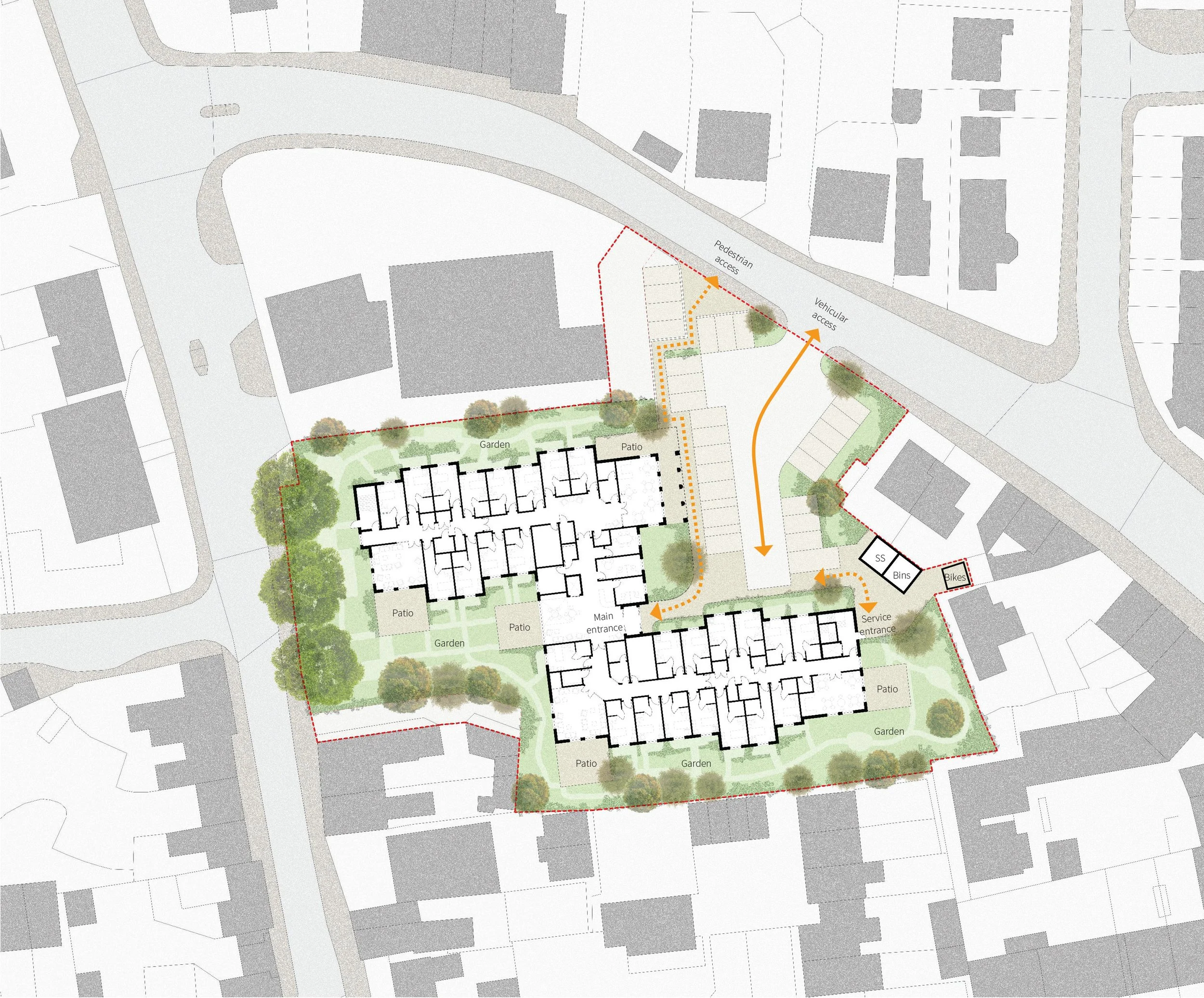 2025. Built Narratives’ design for a new-build care home in Bedfordshire is now with the local authority, seeking their advice as to its acceptability in principle. The building, within a market town, replaces a series of existing dilapidated buildings. The design seeks to create a building which matches the scale of nearby buildings and is set-back from the main road. The care home will provide 67 ensuite bedrooms divided into five care groups across 2.5 storeys. The building will create new gardens around its perimeter, allowing all ground floor residents direct access to outdoor space. On the first and second floors, care groups can access shared terraces accessed from day spaces.